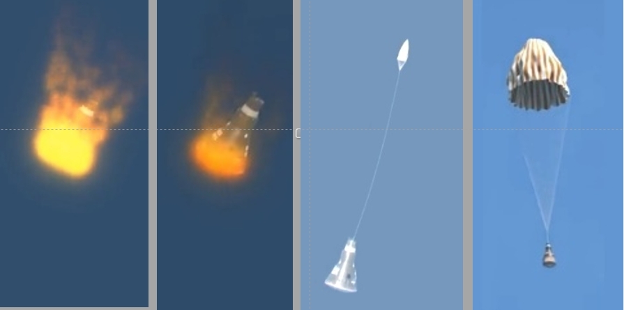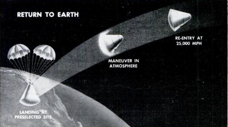 À esquerda está a representação da descida da cápsula com o superaquecimento. À direita está a cápsula descendo, primeiramente com paraquedas menor, e depois com paraquedas maior. O Módulo de Comando do Programa Apollo se baseou nesse sistema, mas no local de onde sairiam os paraquedas deveria ser possível montar o mecanismo de acoplamento e também possibilitar a passagem de astronautas entre os módulos. Além disso, havia também dois tipos de tampas, uma cônica e outra reta, sendo que cada uma deveria estar montada nesse local em determinada etapa da missão.