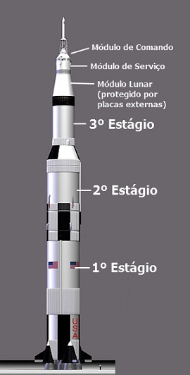 A seguir temos um desenho do foguete Saturno V com os três módulos acoplados usados no Programa Apollo, nas missões 11 a 17 com seus estágios e módulos. O foguete tinha a altura total de 110,6 metros.