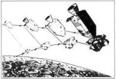 A pobreza de ideias para a ida de homens à Lua fica evidente nos três desenhos anteriores mostrando o lançamento da Terra de um foguete com vários estágios. Depois de várias manobras de alunissagem não mostradas no desenho, aparece uma nave (basicamente um Módulo de Comando) saindo da Lua de modo estranho e inviável. Ao se aproximar da Terra o conjunto do propulsor da nave deixou de aparecer, como se essa separação fosse algo simples.