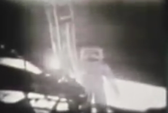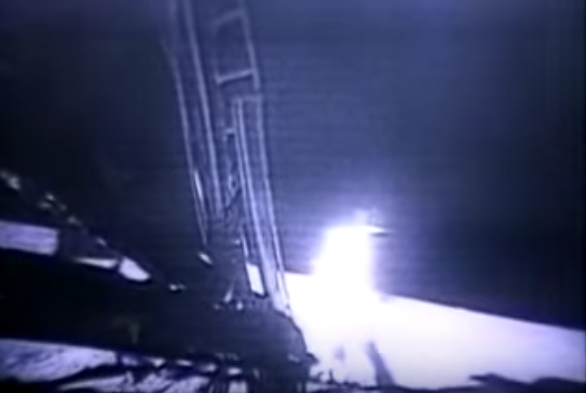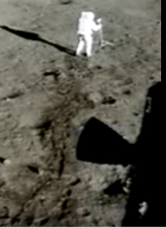A foto acima é do vídeo da NASA, One Small Step For Man. que está no YouTube e mostra a suposta descida à Lua. O vídeo tem apenas meio minuto de duração. Nas cenas finais do vídeo, o astronauta aparece como um espectro luminoso, como é mostrado aqui. Aparece claramente que o piso é uma plataforma lisa e que o seu limite forma uma reta, o que seria impossível de se encontrar no solo irregular da Lua. Essa cena deve ter sido feita para mostrar a farsa.2