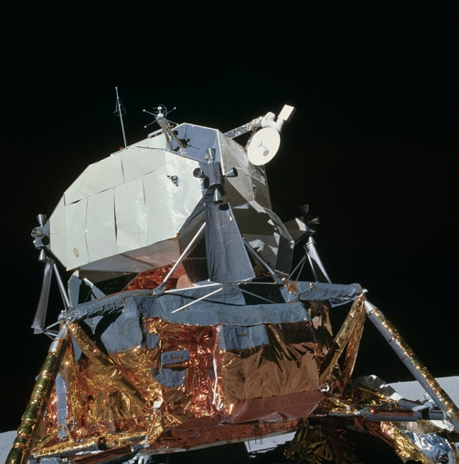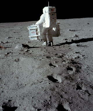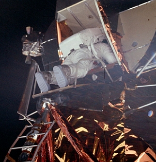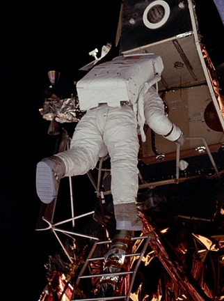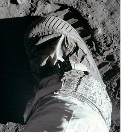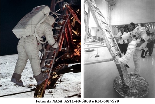 Muitas pessoas viram e analisaram as fotos de Aldrin supostamente descendo ao solo lunar e aparentemente ninguém observou as irregularidades que serão descritas a seguir. Pelas fotos, podemos verificar que Aldrin não se apoia com os pés como deveria fazer. Para se entender como ele manteve o equilíbrio nessa situação, vamos considerar que existiam cabos de sustentação que o mantinham na posição e que foram apagados das fotos.