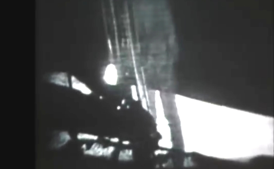 Para denunciar a farsa, os componentes do grupo que a denunciou filmaram outras cenas representando a suposta primeira descida ao solo lunar. Nesta foto do vídeo cujo título aparece acima, ao invés de uma plataforma, aparece a enorme sombra do módulo lunar. Armstrong aparece depois de descer a escada e diz sua frase de efeito. Esta suposta descida teria sido filmada por Aldrin.