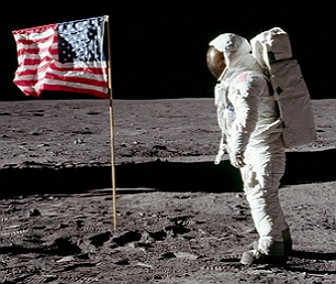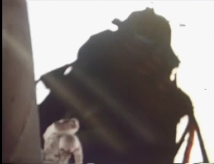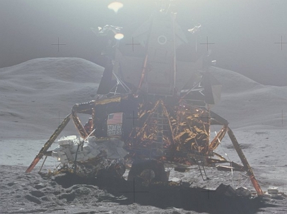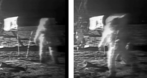 Um astronauta transparente? Aparentemente ninguém reparou na cena incomum. Aldrin foi filmado correndo, inicialmente ao lado da bandeira e de uma haste, mas ao passar em frente da haste ela continuou visível através dele. Esse efeito especial não foi acrescentado para divertir o espectador e sim para demonstrar que a cena foi filmada em estúdio.