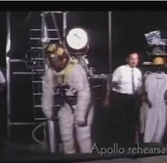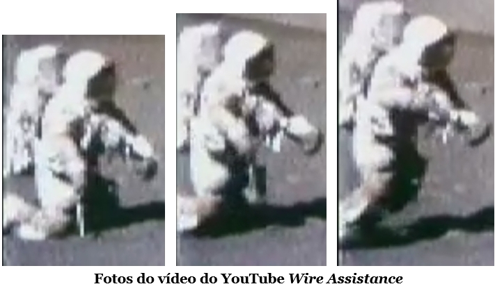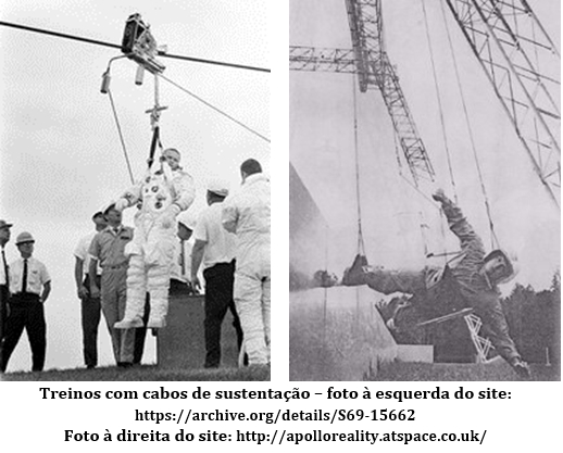 As fotos anteriores mostram que houve treinamento dos astronautas com cabos de sustentação. A última foto apresenta uma pose que aparece diversas vezes em fotos supostamente tiradas na Lua.