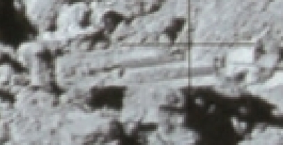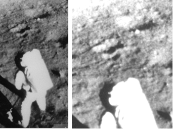 As duas fotos anteriores são detalhes da foto de código AP11FR01, de Armstrong, supostamente tirada na Lua. Do lado esquerdo a foto foi reduzida. Do lado direito aparece um detalhe da foto com alteração no brilho e no contraste. Podemos notar o que parece ser um cabo de sustentação não totalmente apagado.