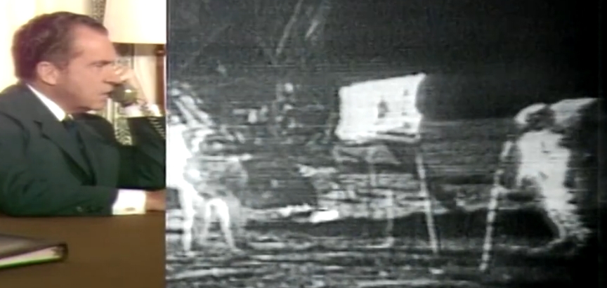 No lado direito desta foto, Aldrin aparece ainda mais inclinado do que na foto anterior, supostamente para ouvir o presidente Nixon. Armstrong aparece em uma pose extravagante.