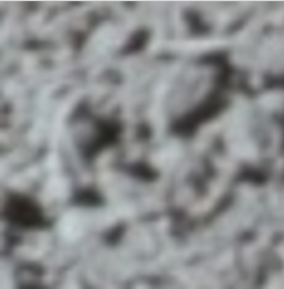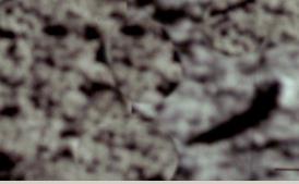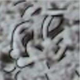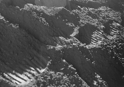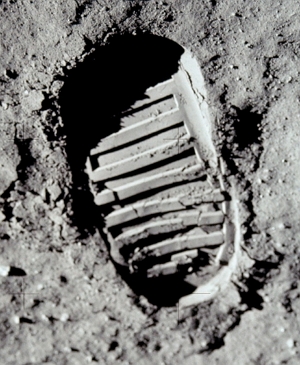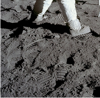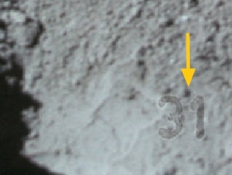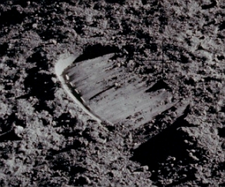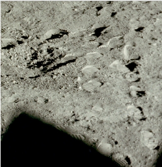 A foto acima é da pegada supostamente deixada no solo lunar pela bota de Aldrin durante a missão da Apollo 11 (ela também é apresentada com um giro de 180°). Na parte do meio aparece uma marca com curvas que não poderiam se formar normalmente. Isso fica mais claro com o detalhe ampliado visto a seguir: