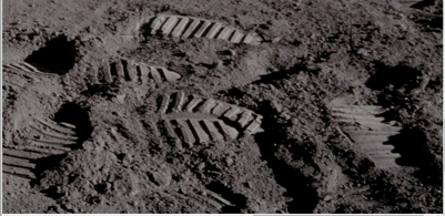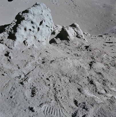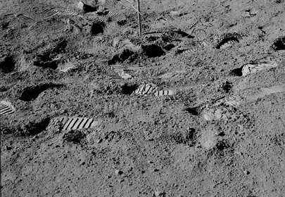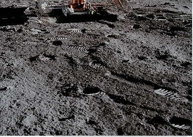 Pegadas profundas deixadas nas rochas, mesmo a Lua tendo somente 1/6 da gravidade terrestre. Provavelmente, este foi mais um trabalho do artista escultor, para denunciar a farsa.