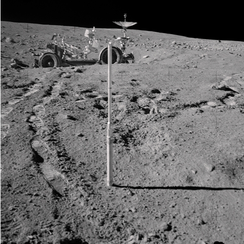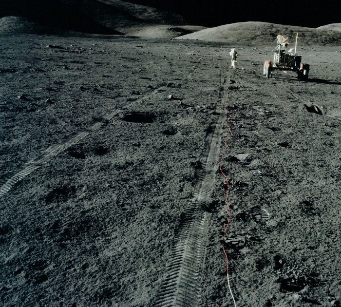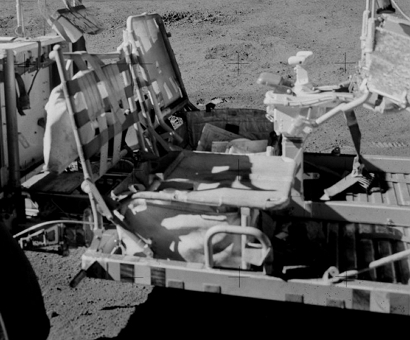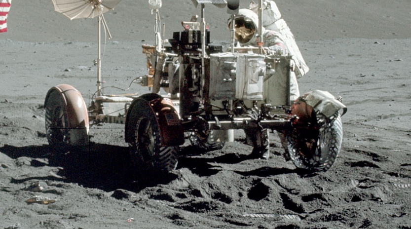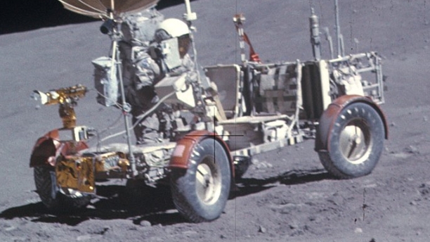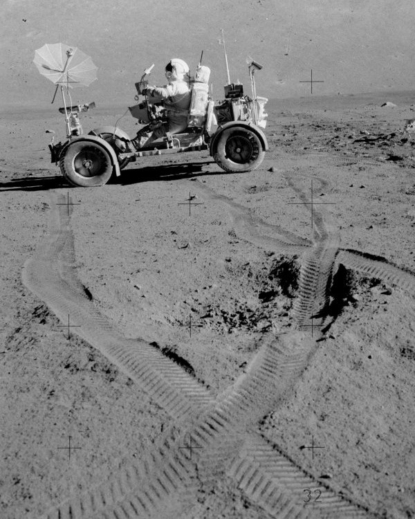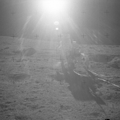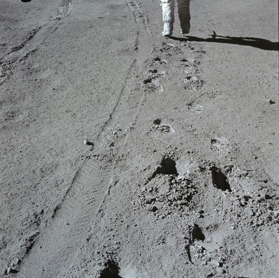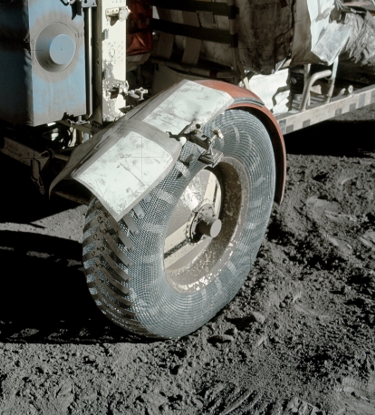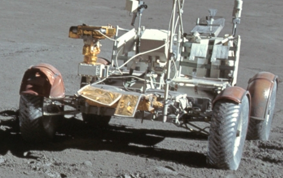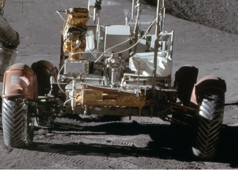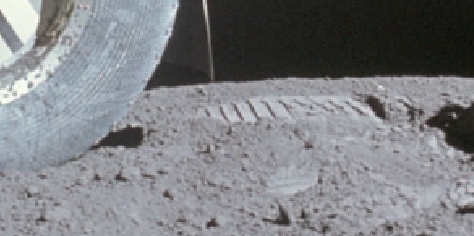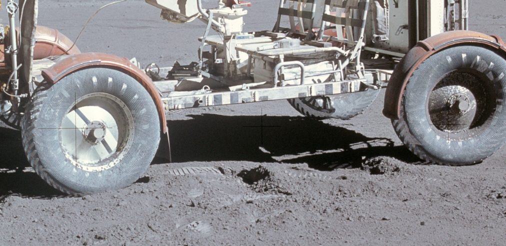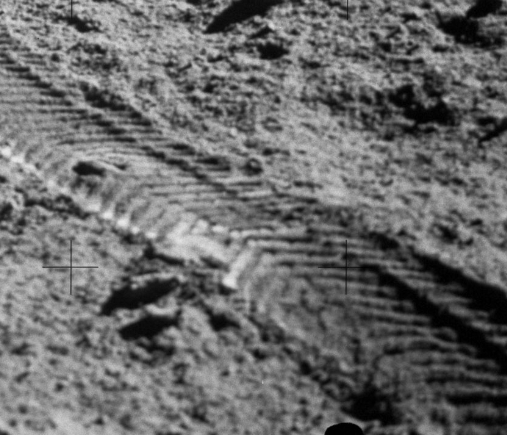 Nesta foto do veículo da Apollo 17 pode-se notar que o pé do suposto astronauta está afundado no solo e que há inúmeras marcas profundas de botas, mas o veículo não deixou nenhuma marca de pneu no solo. A parte interna, com pintura avermelhada, do para-lama do lado direito, se prolonga para baixo, quase chegando ao solo. Esse para-lama tem um remendo que será visto em detalhes nas fotos seguintes..
