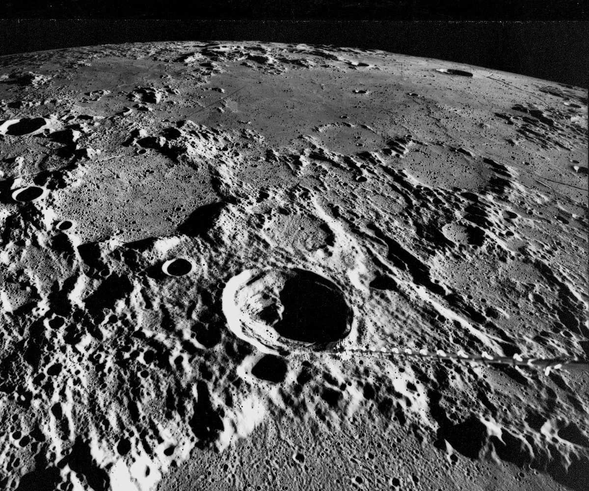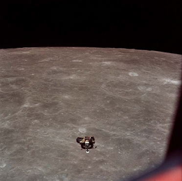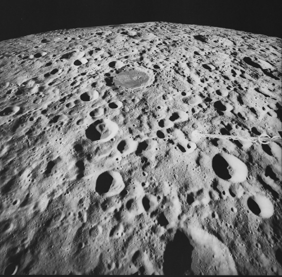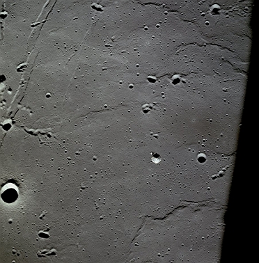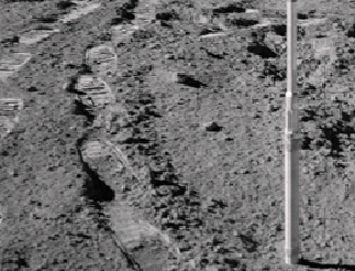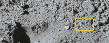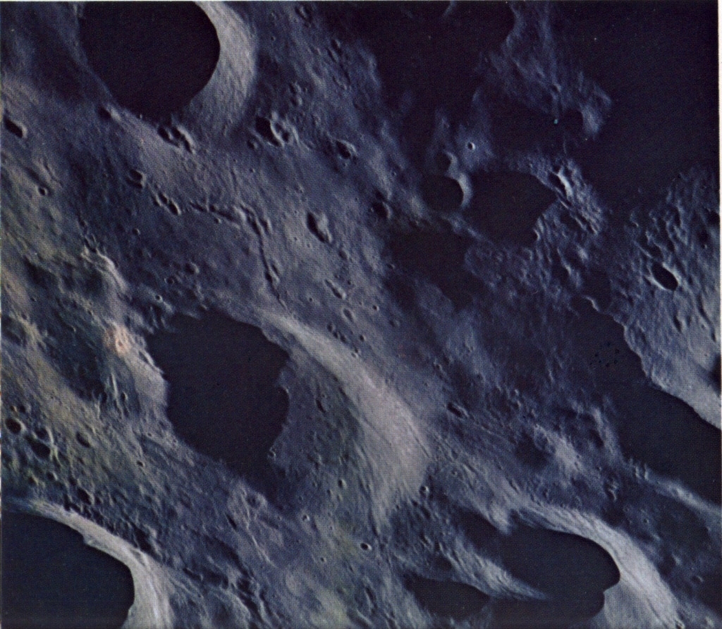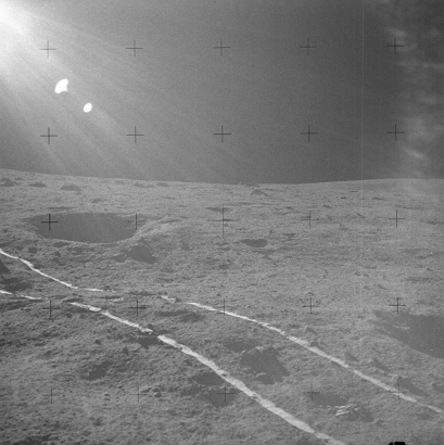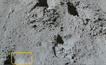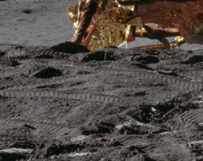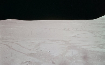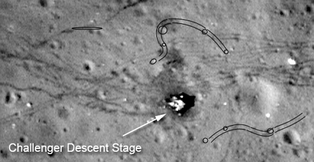 A foto acima, tirada em 2009 em baixa altitude na Lua, é mais uma parte do quebra-cabeça envolvendo o Programa Apollo, por ser apresentada como prova de que os astronautas estiveram na Lua. Challanger Descent Stage é a parte do Módulo Lunar que teria permanecido na Lua. Aparecem várias marcas tênues dos pneus do veículo lunar (lunar rover tracks). Entretanto, em algumas curvas deveriam aparecer as marcas dos quatro pneus, como foi comentado na foto anterior e isso ficará mais evidente na próxima imagem. Além disso, nota-se que essas marcas de pneus sugerem que o veículo passava sobre as pedras e outros obstáculos no caminho, ao invés de evitá-los.