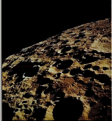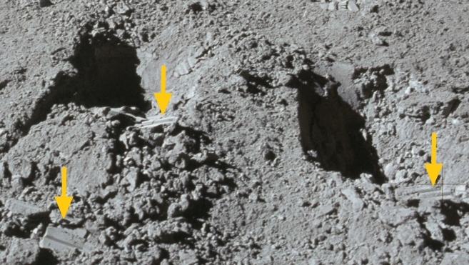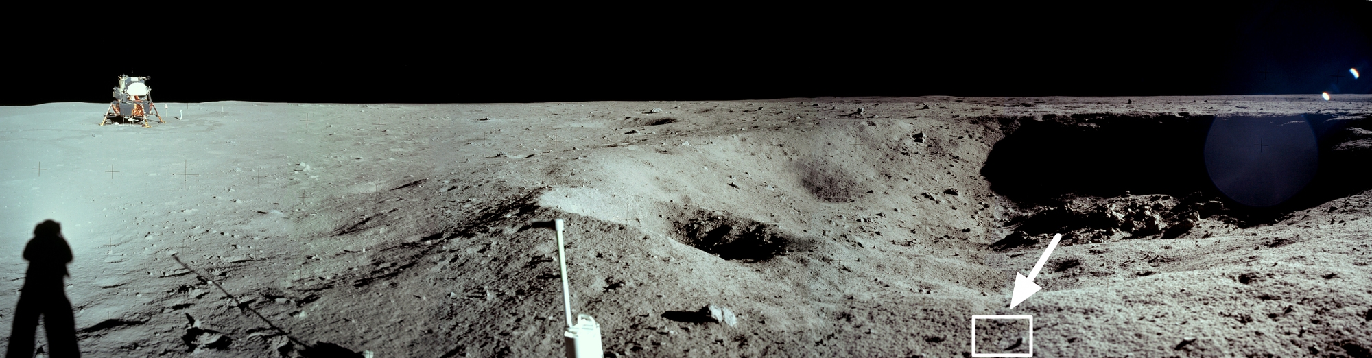 Um amontoado de peças e componentes encontrados no suposto solo da Lua. Isso é o que será mostrado nas duas fotos seguintes, com as ampliações do retângulo apontado pela seta desta foto, que é apresentada como uma vista panorâmica da Lua.