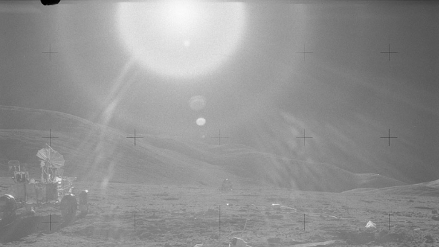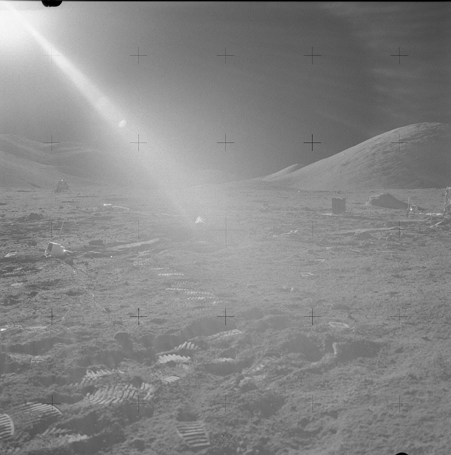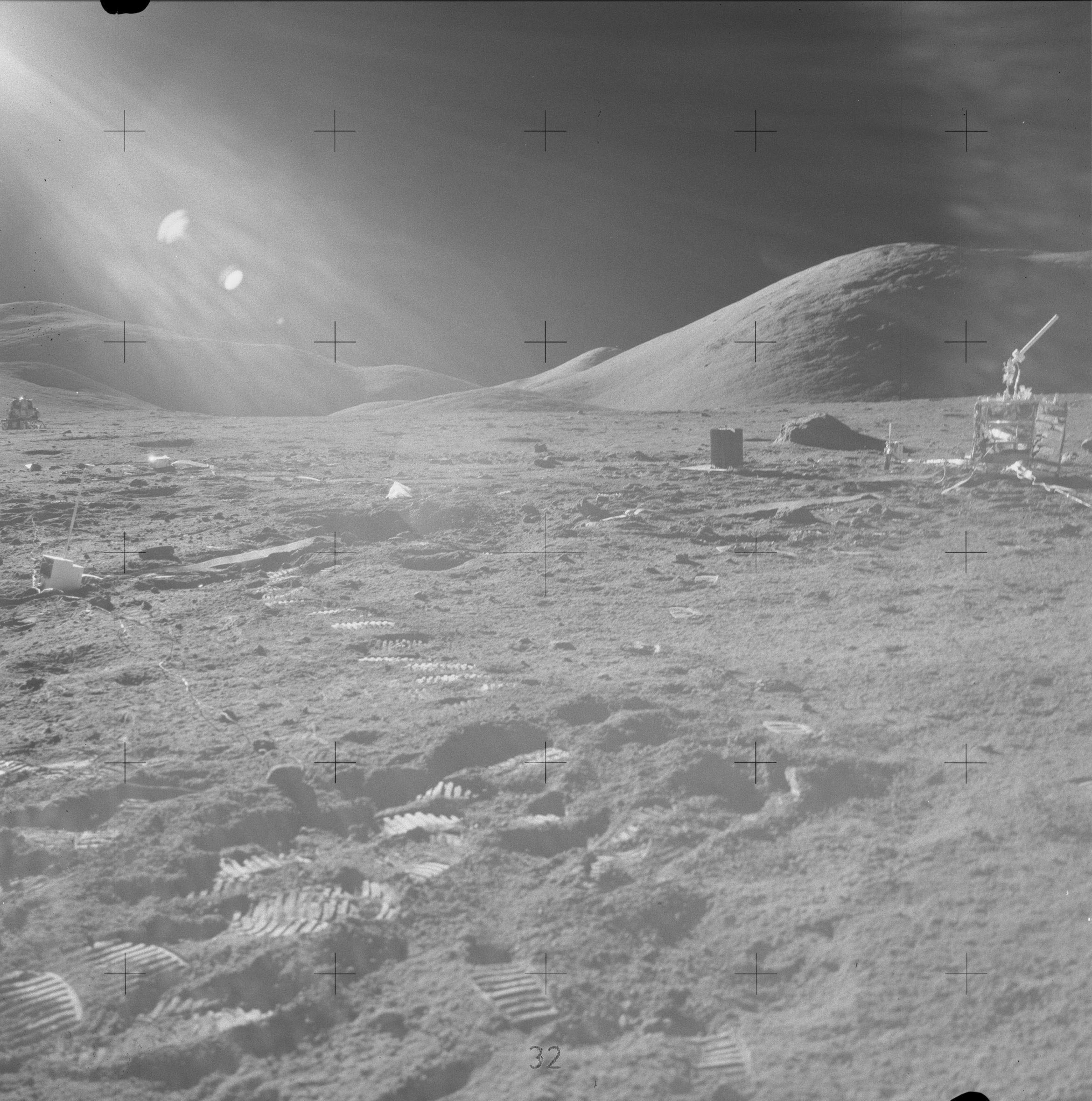 As fotos seguintes mostram o veículo lunar parado, sem ter marcas de pneus no solo, enquanto são visíveis as pegadas de botas, tudo feito de propósito. Essas fotos às vezes aparecem como pequenos detalhes de fotos maiores, evitando assim que os erros propositais fossem notados.