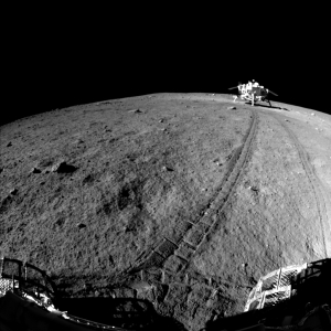 Foto oficial de 2013 tirada pelo lunar rover Yutu chinês mostrando o Chang 3 Lander sobre o que parece uma mini Lua. Talvez tenha sido publicada para mostrar que eles também podem simular pousos na Lua.Pode-se ver essa cena no vídeo do YouTube;
